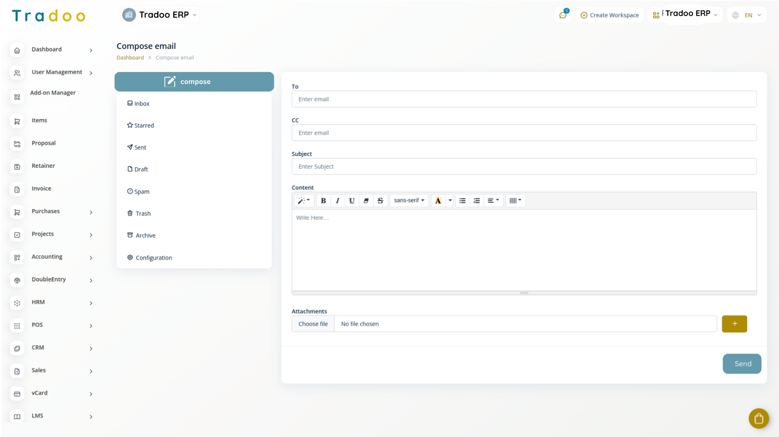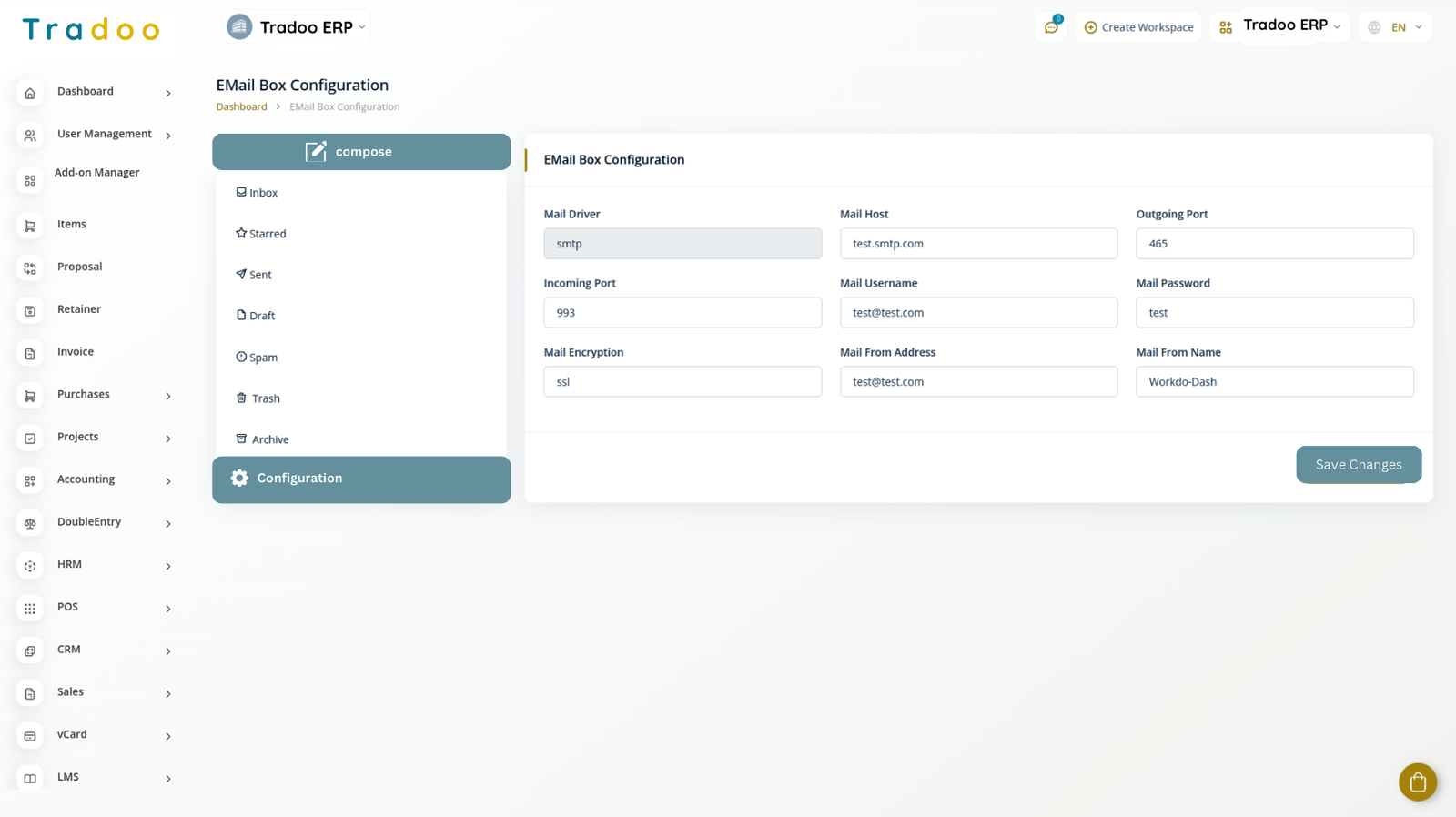 The Email Box module is a robust tool for simplifying email management. It integrates seamlessly with your SMTP server, allowing full control over folders like Inbox, Drafts, Spam, Sent, Trash, and Archive. Additionally, it enhances email interactions, making management more efficient and intuitive.