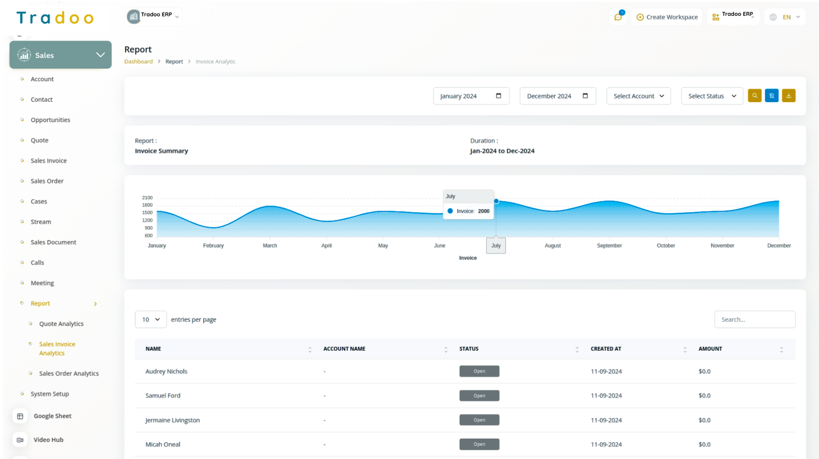 Get smart, automated analytics delivered right to you. Access detailed reports for sales orders, invoices, and quotes—all filtered by customizable parameters such as status, amount, assigned users, and creation date. Easily print invoices, add new items to existing orders, and manage everything from one centralized report dashboard.