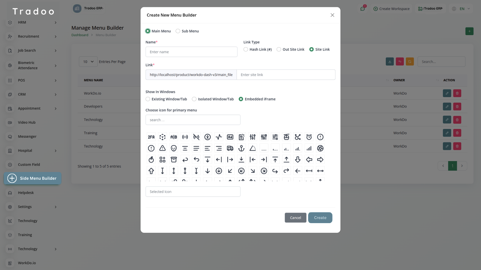 Easily create and manage side menus with the Create button. Customize, edit, or delete menus as needed. Sidebars can be configured from both the company and super admin sides, with super admin-enabled menus visible across all companies.