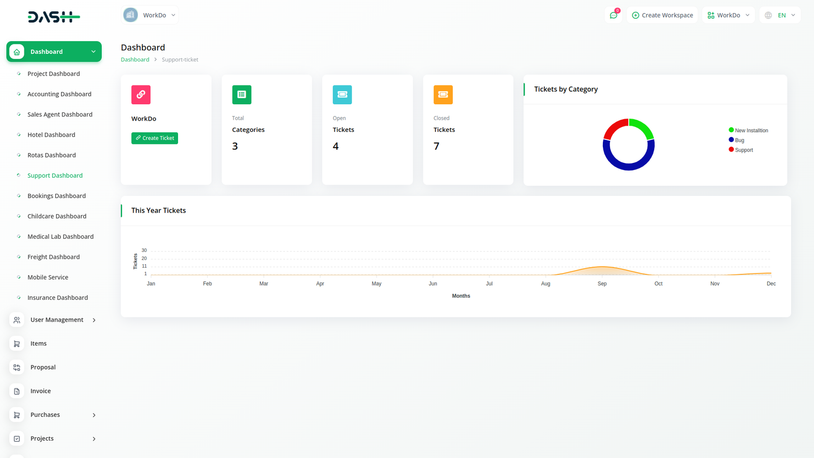 Easily access open and closed ticket statistics with intuitive visual breakdowns. View monthly ticket trends with interactive charts and stay informed at a glance.